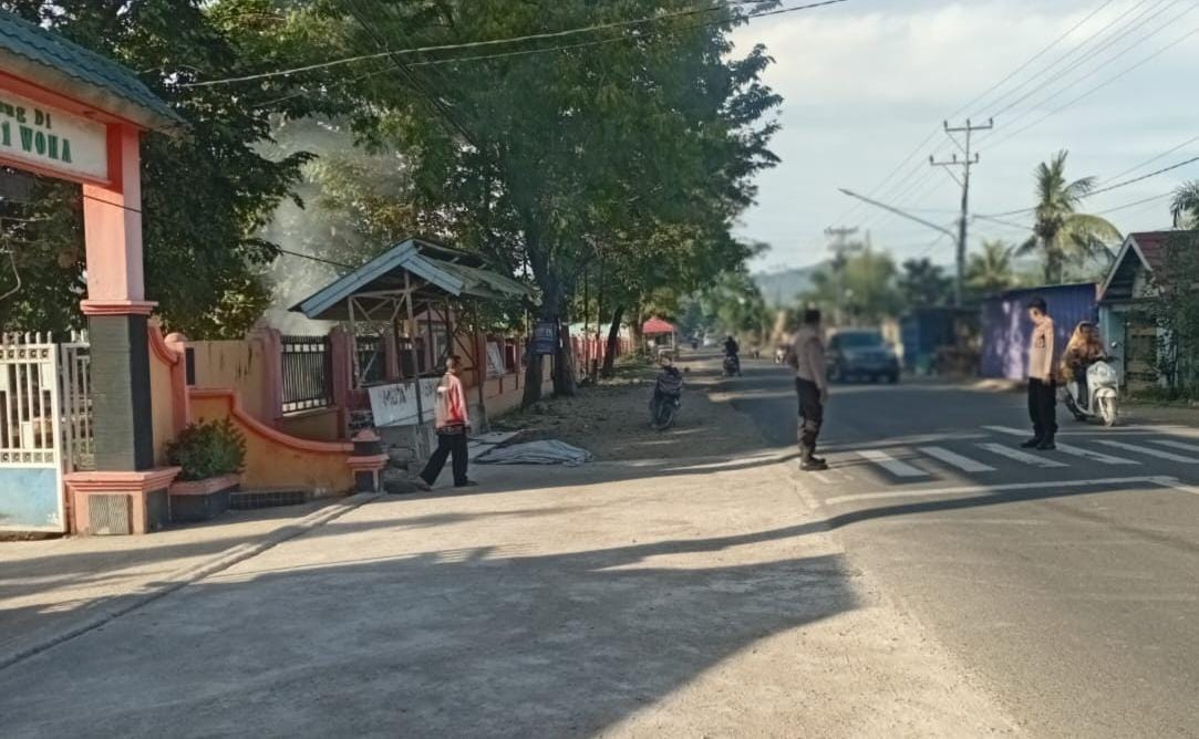 Terlihat anggota Polsek Woha membantu menyeberangkan anak sekolah serta anggota lainnya mengatur arus Lalulintas dan membantu menyeberangkan pelajar yang hendak ke Sekolah.